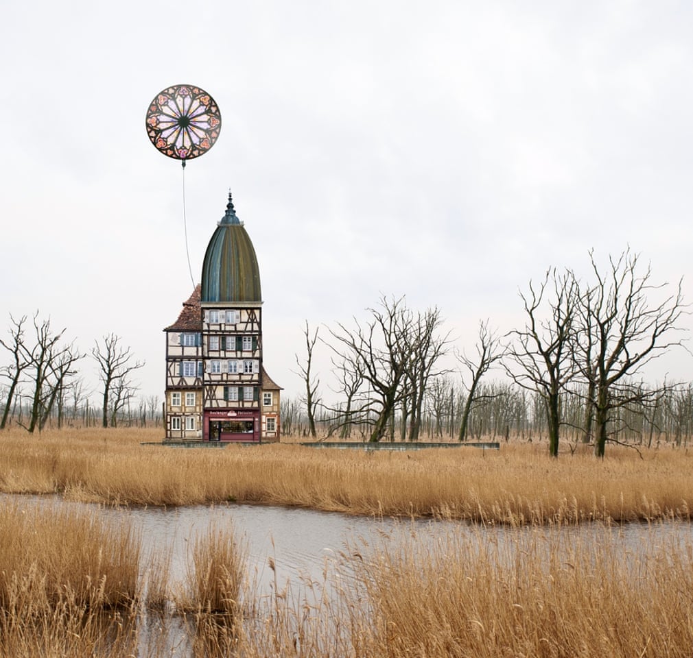 Process– The artwork is an architectural collage. Jung often makes architecture out of lots of other buildings chopped and finely put together as a collage. The background of this image is a photograph of a swamp area in Germany near the border of Poland. Jung then used other photographs of homes and cottages to make the building in the picture. The balloon in the image is from a photograph of a Gothic church he took in the small French city of Wissembourg. He had made this image using Photoshop. He used to just use scissors and glue as a child. He would have commenced his work in his studio at home and it would have been done in one day or two, and not over a period of time.